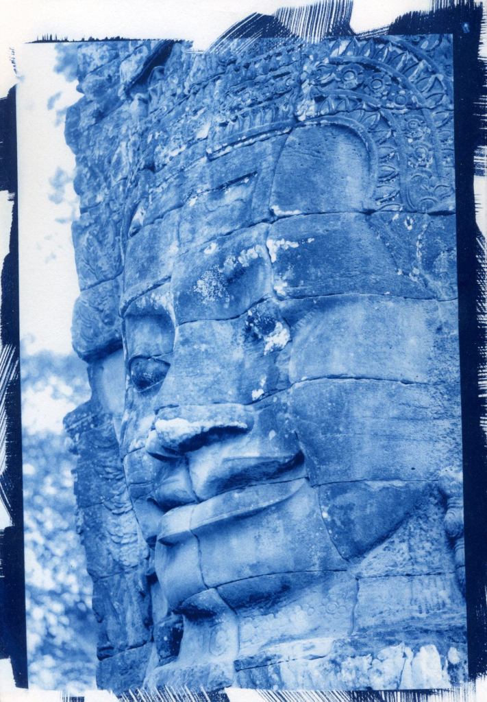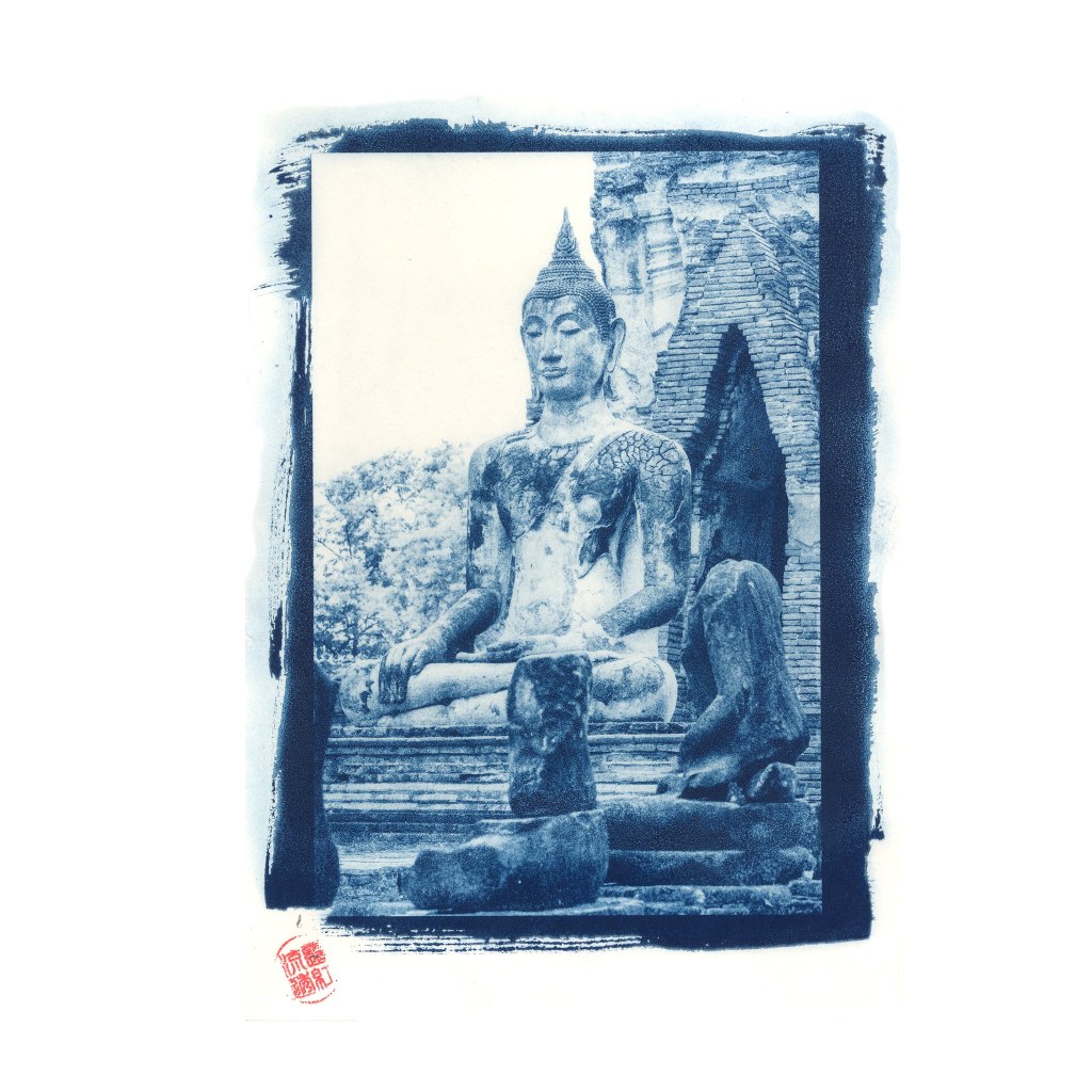 Se la precedente immagine ci portava nel dinamismo delle divinità indiane, questa cianotipia ci immerge nel silenzio profondo di un tempio buddista (probabilmente tra le maestose rovine di Ayutthaya o Sukhothai). Qui, il blu smette di essere solo un colore e diventa uno stato mentale.