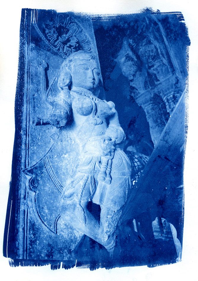 La figura scolpita, con le sue curve morbide e la grazia tipica dell’arte classica indiana, emerge dal blu con una forza nuova. La cianotipia, con i suoi bordi irregolari che rivelano la mano dell’artista, non si limita a documentare un’architettura; ne cattura l’anima.