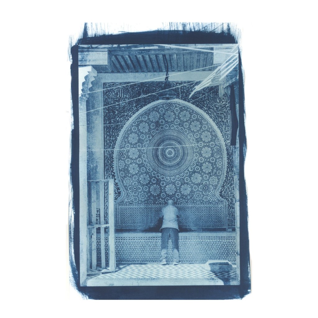 Il processo inizia nell’oscurità del laboratorio, dove preparo una soluzione fotosensibile a base di citrato ferrico ammoniacale e ferricianuro di potassio. Uso un negativo digitale di grandi dimensioni, adagiato direttamente sulla carta. L’esposizione avviene sotto una sorgente di luce UV ( è possibile anche usare direttamente la luce solare), che agisce come un pennello invisibile, scrivendo l’immagine fibra dopo fibra.