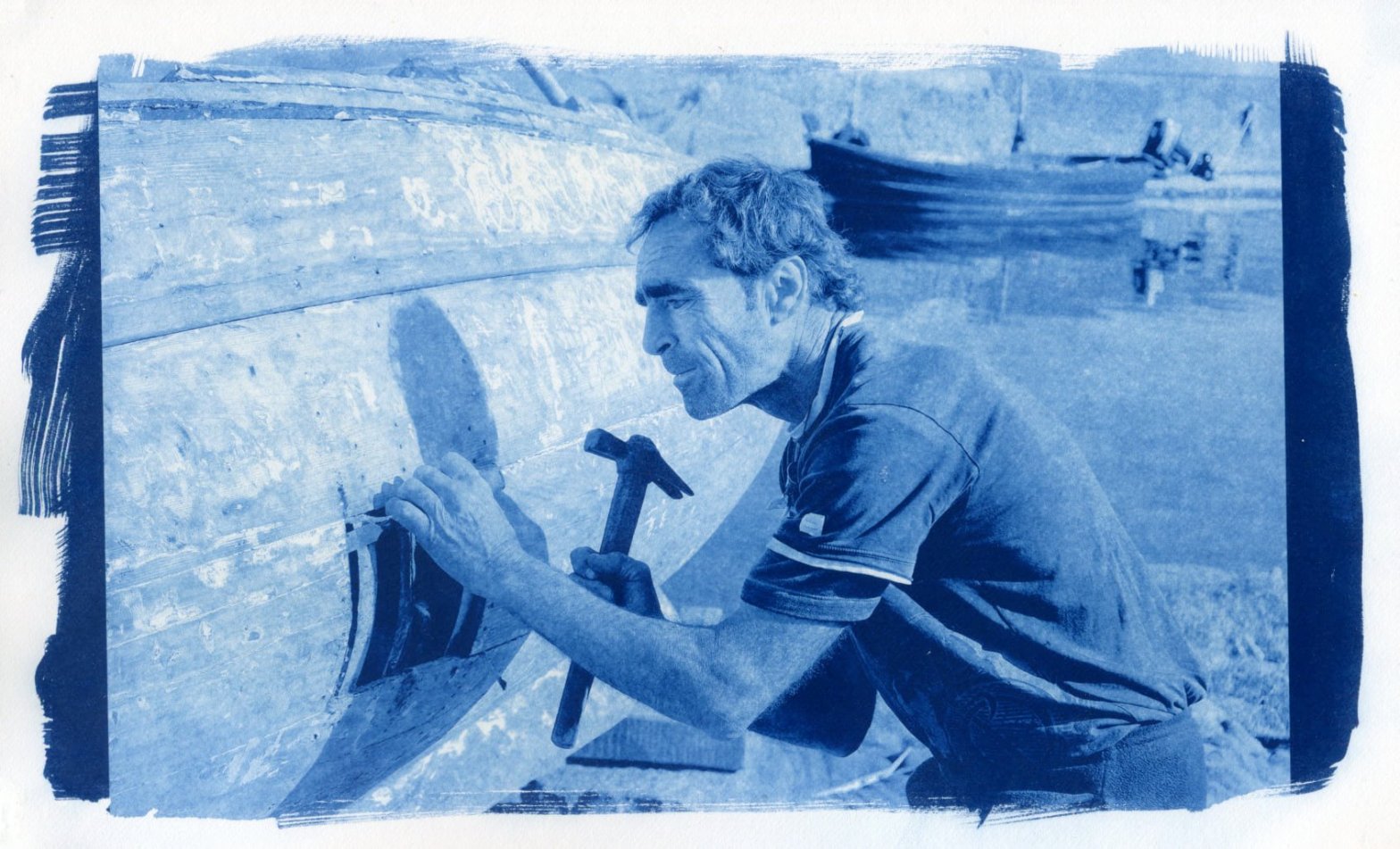 In questa immagine ci spostiamo nella mia Sicilia. Ritraggo uno degli ultimi Maestri d’Ascia siciliani al lavoro nell’antico porticciolo di Aci Trezza, luogo reso immortale dal Verga. Il Blu di Prussia trasforma la fatica quotidiana in un gesto mitico. La resa sulla Bergger Cot 320 permette di percepire la tensione delle mani e la grana del legno usurato. Immergendo questa scena nel blu, essa si stacca dalla cronaca per diventare archetipo: la perseveranza di una tradizione che resiste al tempo.